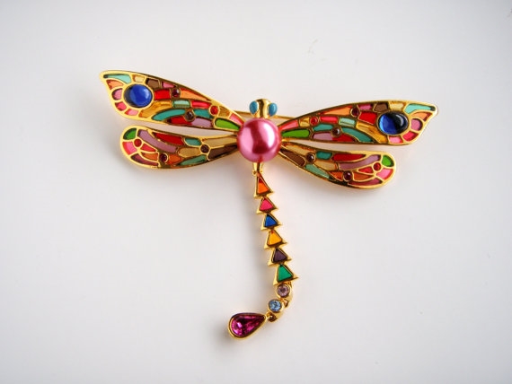 Брошь "Стрекоза" от американского дизайнера Joan Rivers. Потрясающая брошь выполнена в технике витража из цветного стекла, кабошонов и кристаллов, а в центре украшена искусственной жемчужиной розового цвета. Брошь маркирована, в прекрасном состоянии, 9,5 х 8 см.