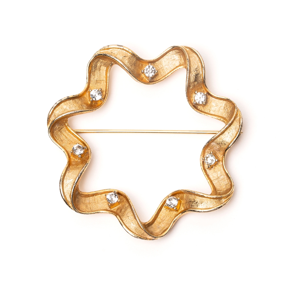 Выполнена из бижутерного сплава, в отличном состоянии, США, 1970-е гг. Размер броши 5,5 х 5,5 см.