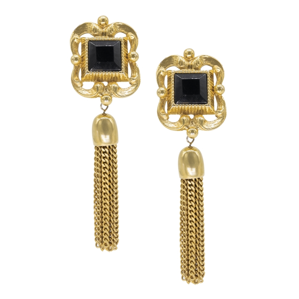 Темный камень строгой огранки обрамлен округлым орнаментом – винтажные клипсы с подвесками-цепочками от Trifari станут для вас элегантным аксессуаром. Фиксируются классической клипсовой застежкой. Маркированы, в отличном состоянии, длина – 8 см, ширина – 2,3 см., США, 1980-е гг.